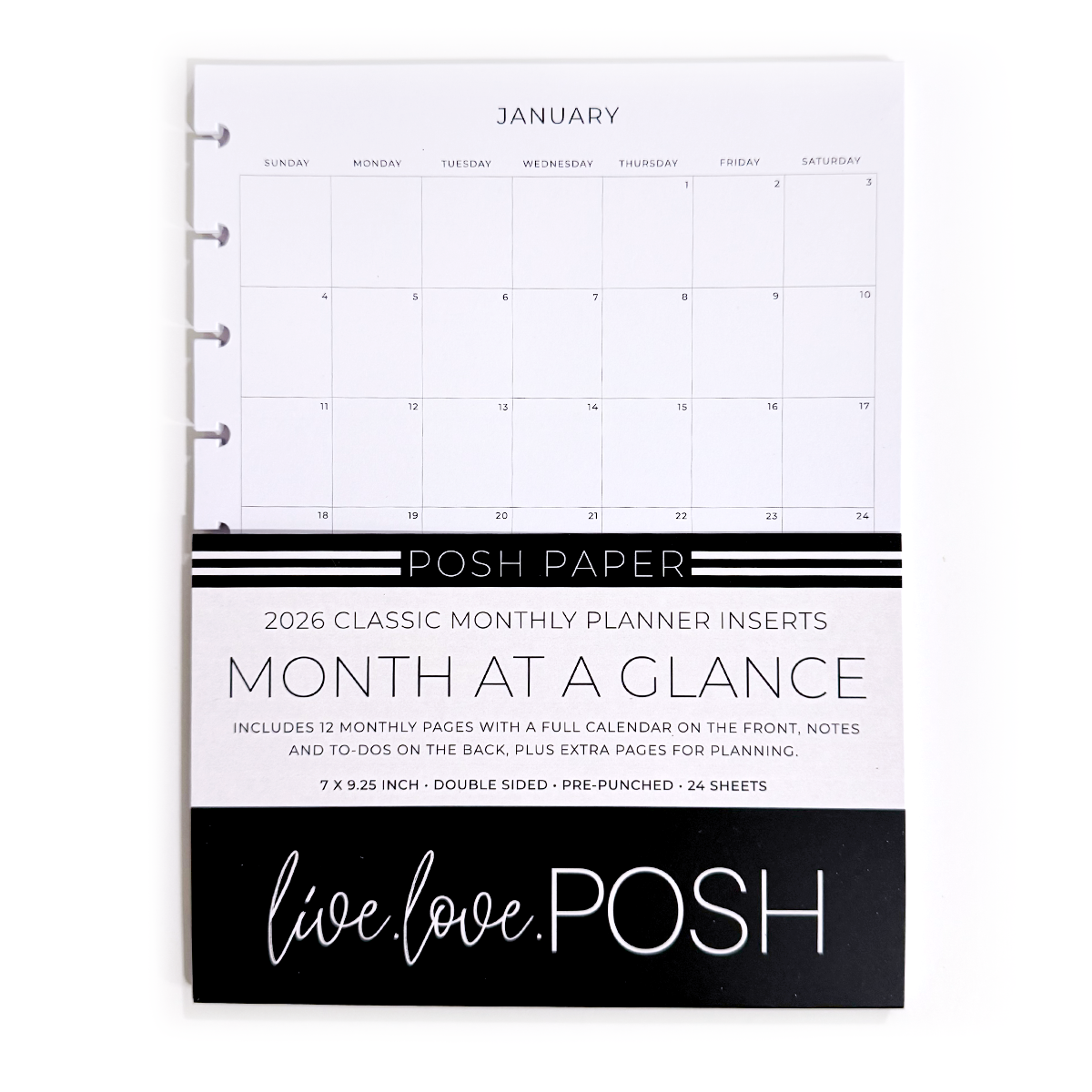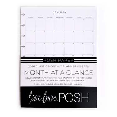 Stay organized and inspired all year long with our 2026 Month at a Glance Classic Planner Inserts. Each month gives you a beautifully simple overview with a full calendar and space for notes, helping you plan with clarity and ease. On the back, you will find two dedicated to-dos checklists and five highlight boxes, perfect for capturing goals, important dates, and monthly priorities.