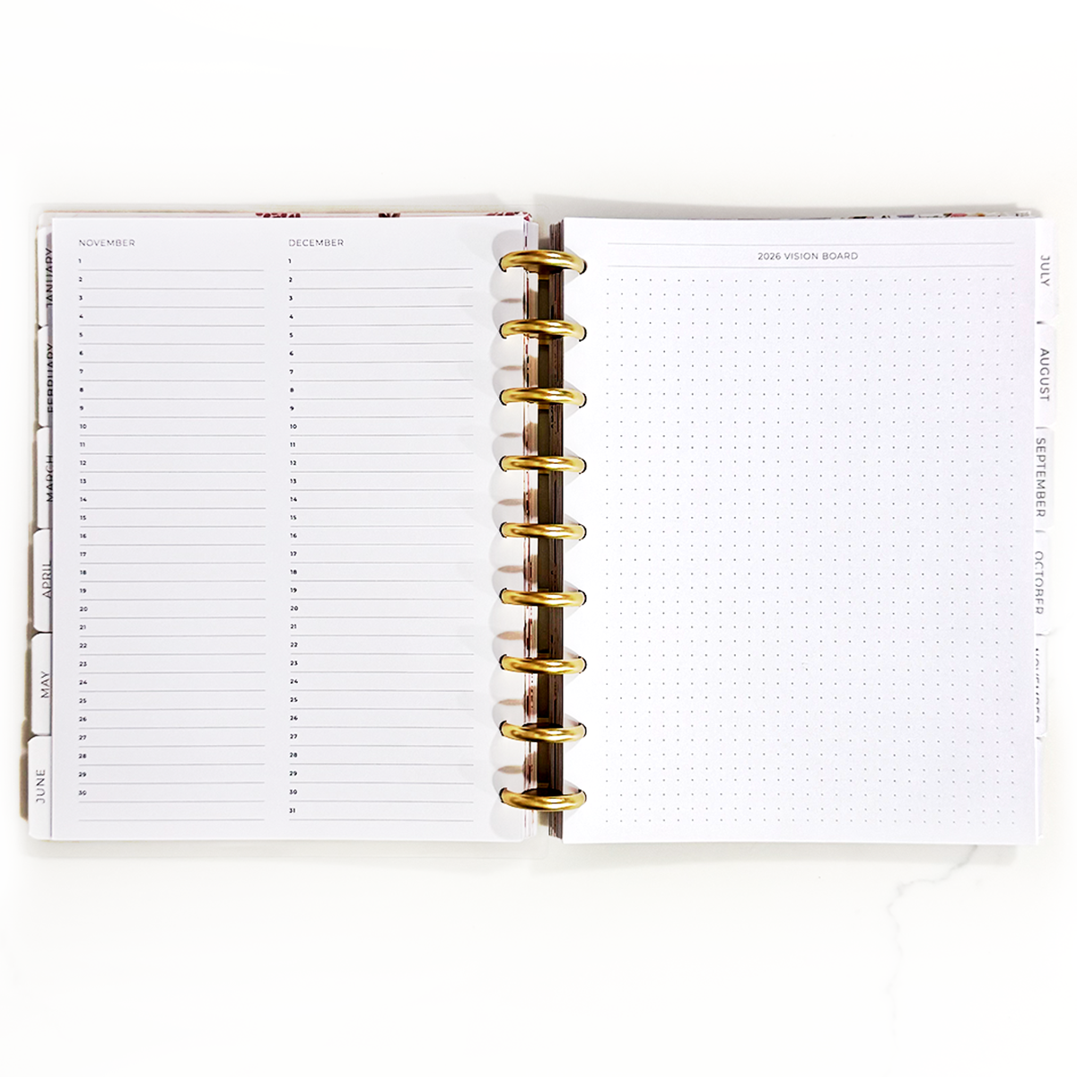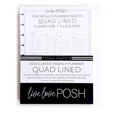 Our 2026 Classic Quad Lined Planner Inserts are designed for maximum productivity with a clean, functional layout. It includes 12 months of monthly and weekly pages, offering a full year of streamlined planning.  Each week features 7 quad lined boxes and a "This Week" checklist for all your to-dos. We also added specialty pages featuring a vision board, annual planning, goal-setting, annual bill tracker, books to read, and more!