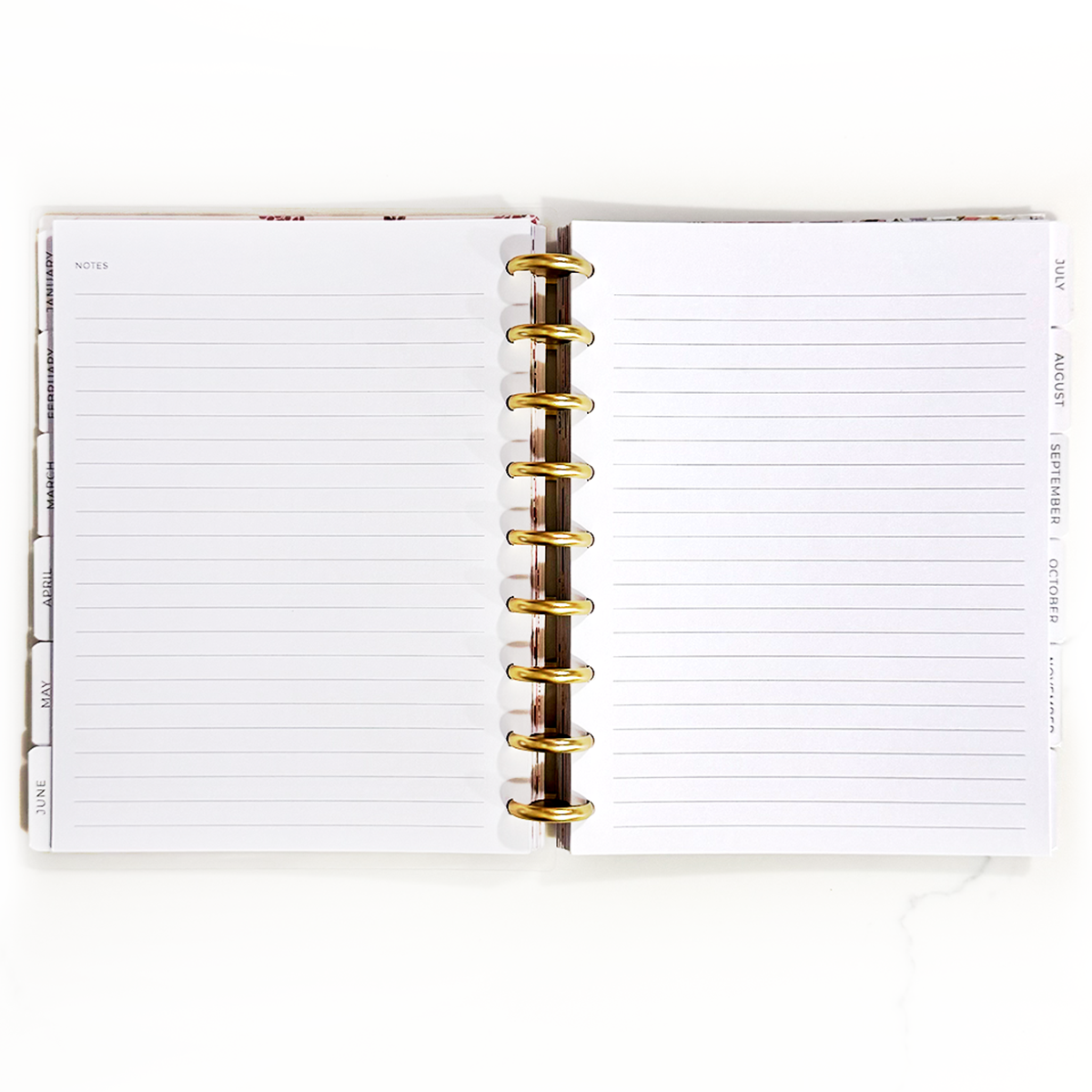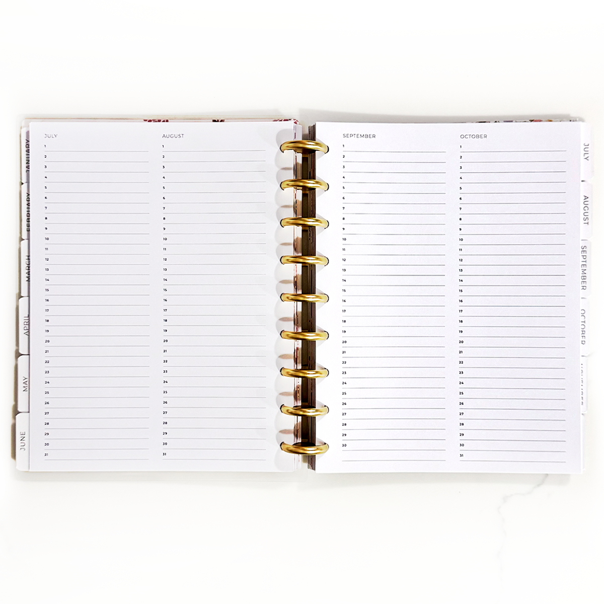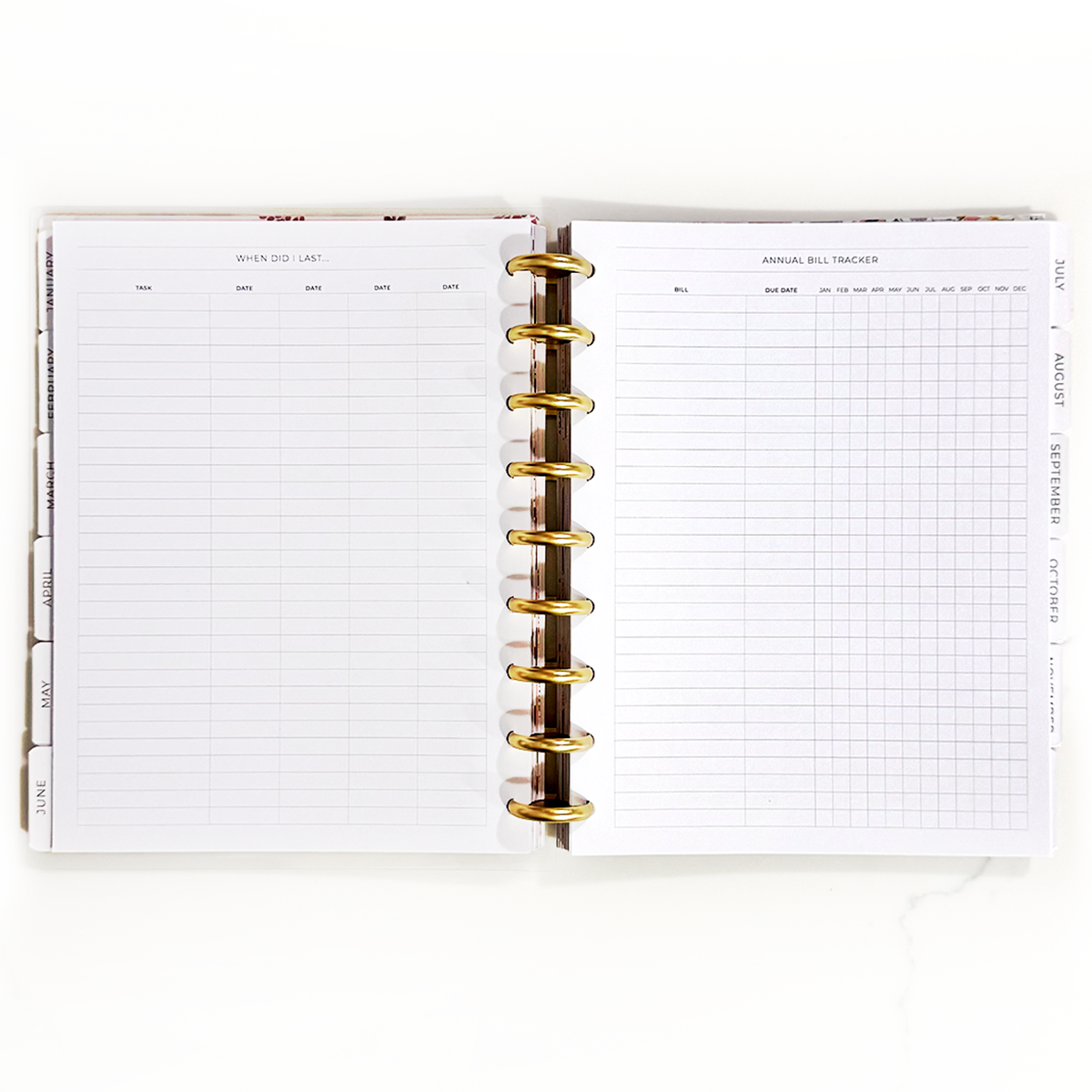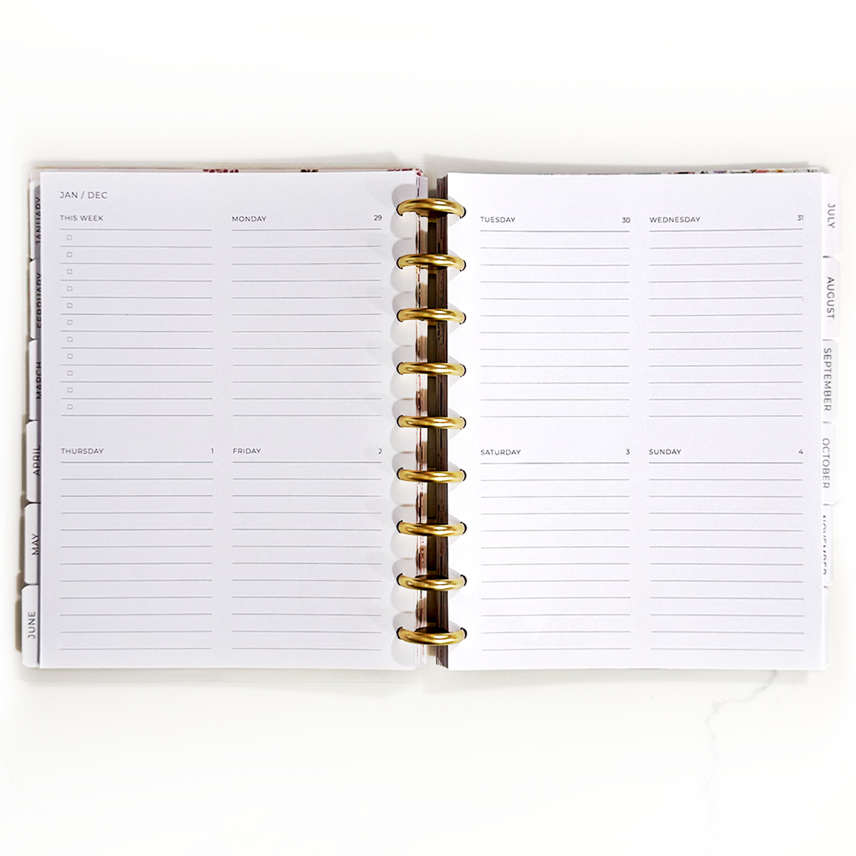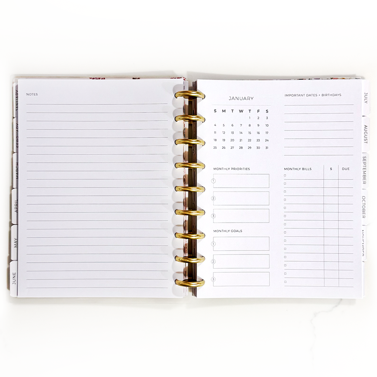 • Each month features a monthly overview page to jot down important dates/ birthdays, monthly bills, monthly priorities, and monthly goals.