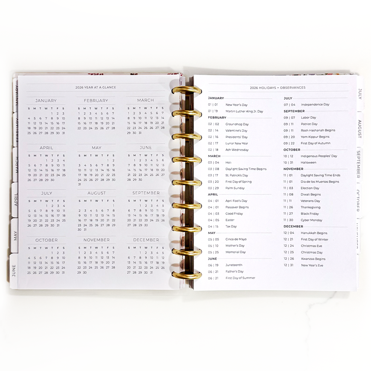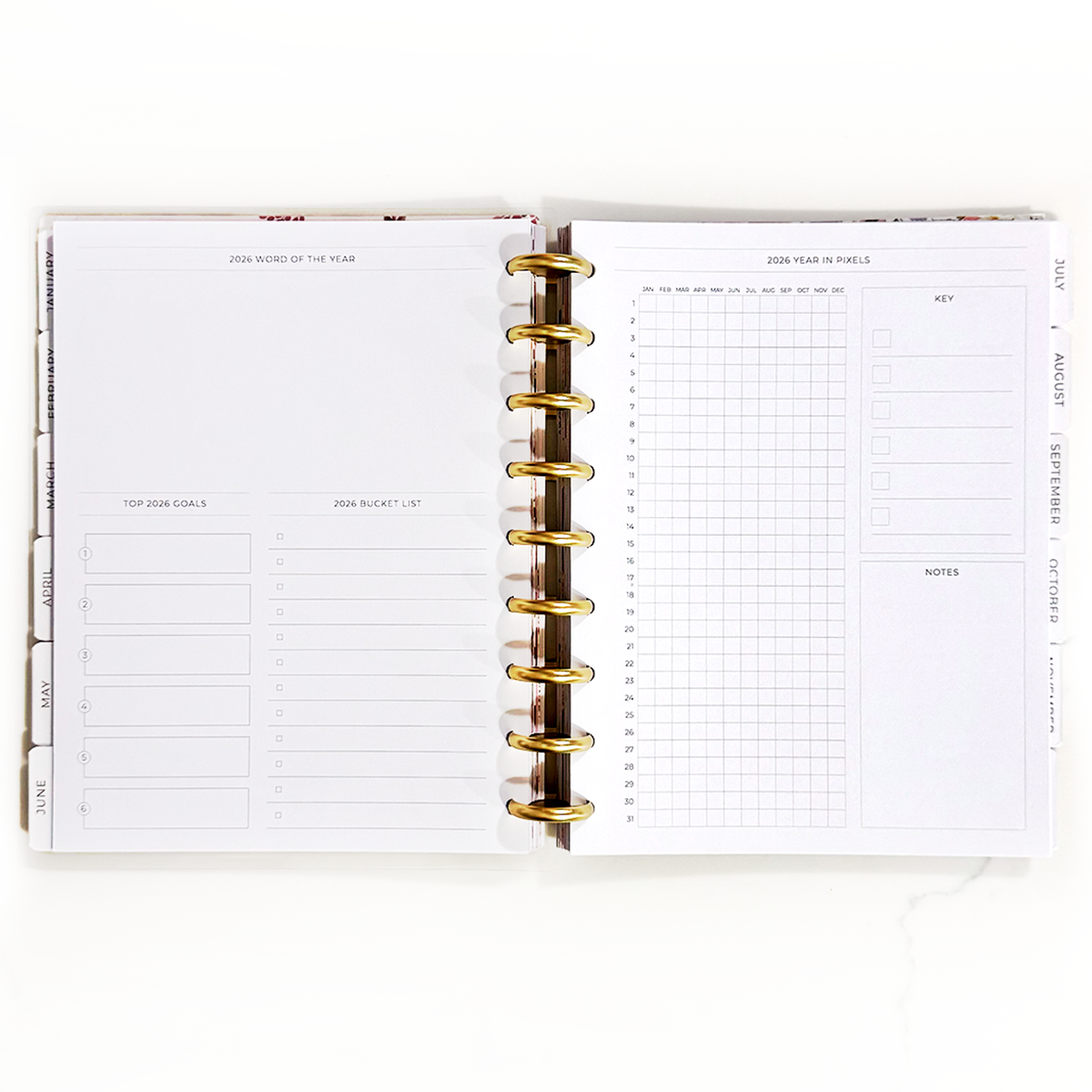 • Bonus pages: Year at a Glance, 2026 Monthly Plans, Perpetual Calendar, 2026 Vision Board, 2026 Bucket List, 2026 Year in Pixels, When Did I Last..., Annual Bill Tracker, and 2026 Books.