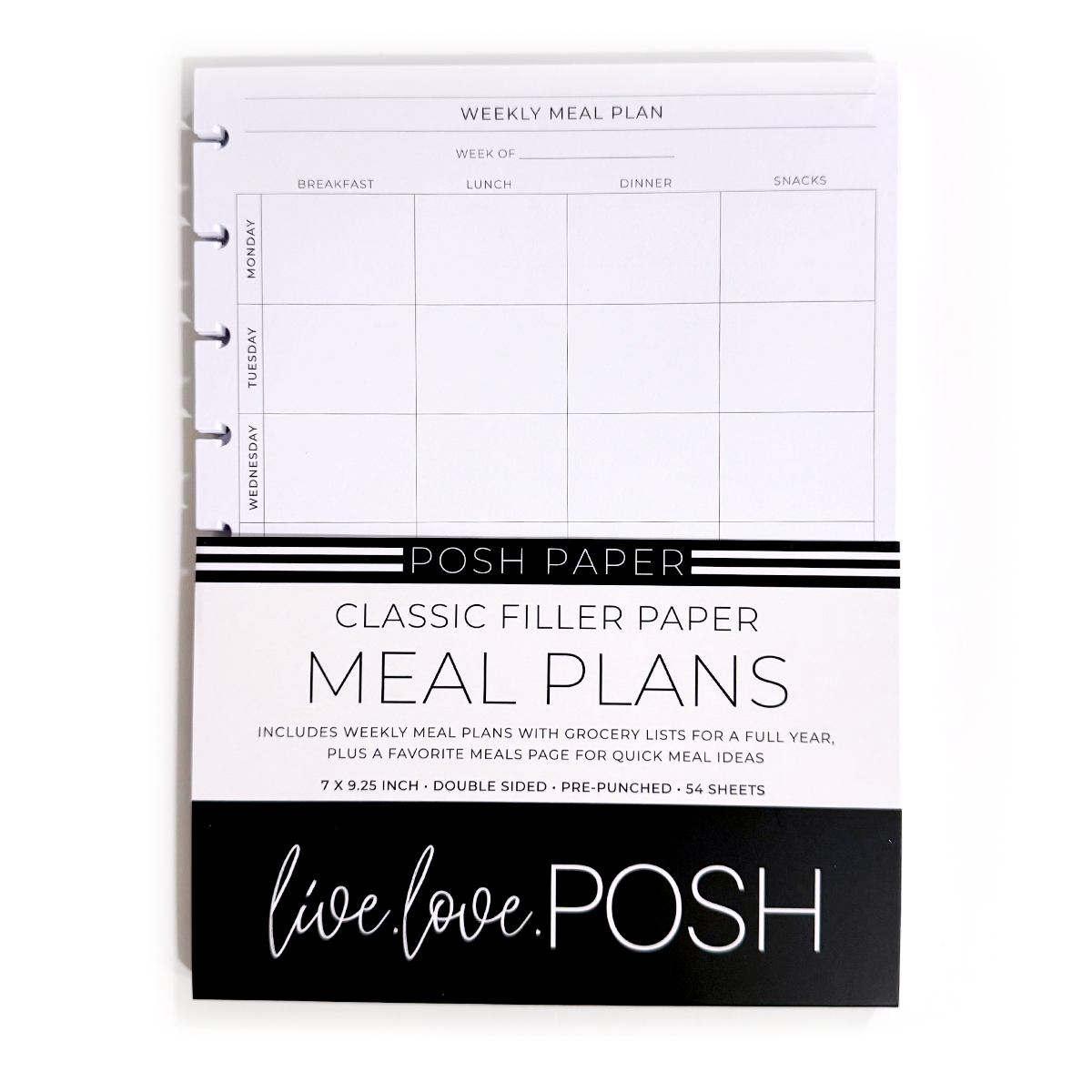 Make meal planning simple and stress-free with our Meal Plans Classic Filler Paper. Designed to help you plan breakfast, lunch, dinner, and snacks for every week of the year, with a dedicated grocery list on the back page for streamline shopping. Bonus pages let you record favorite meals across handy categories like Family Favorites to Leftover Hacks. These pages are a perfect addition toy your Classic-size disc-bound planner.