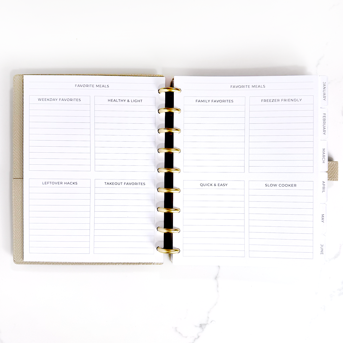 - Includes 2 extra pages to list out Favorite Meals featuring: Family Favorites, Freezer Friendly, Quick & Easy, Slow Cooker, Weekday Favorites, Healthy & Light, Leftover Hacks, and Takeout Favorites.