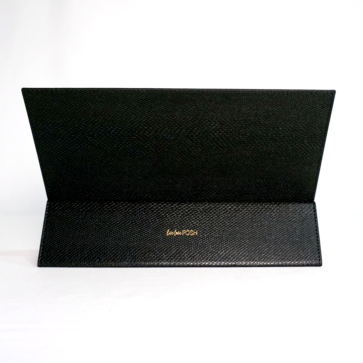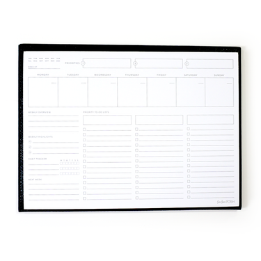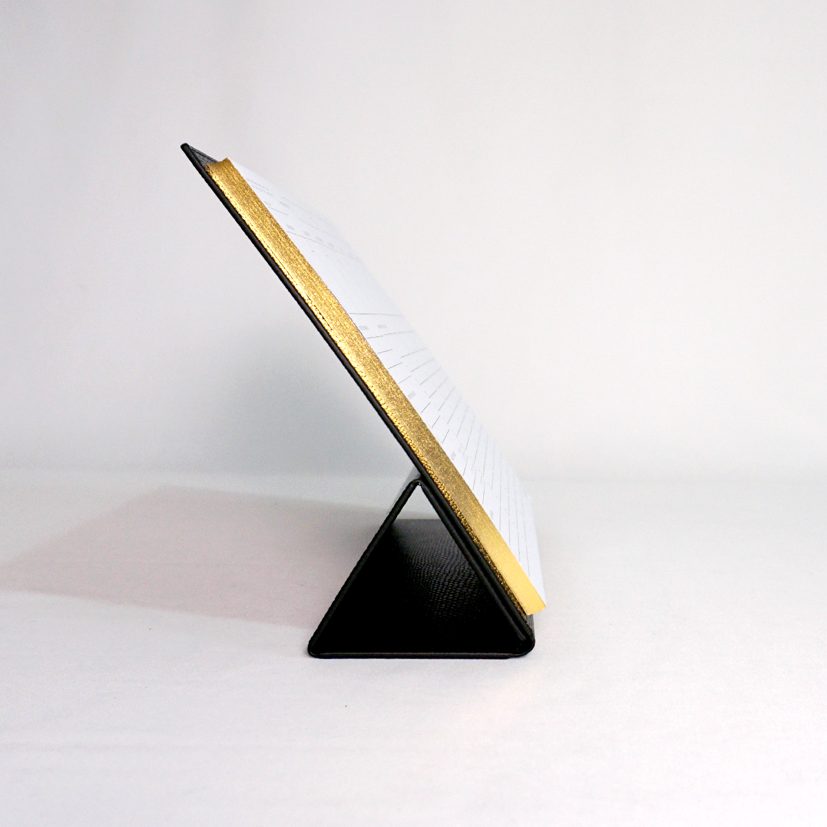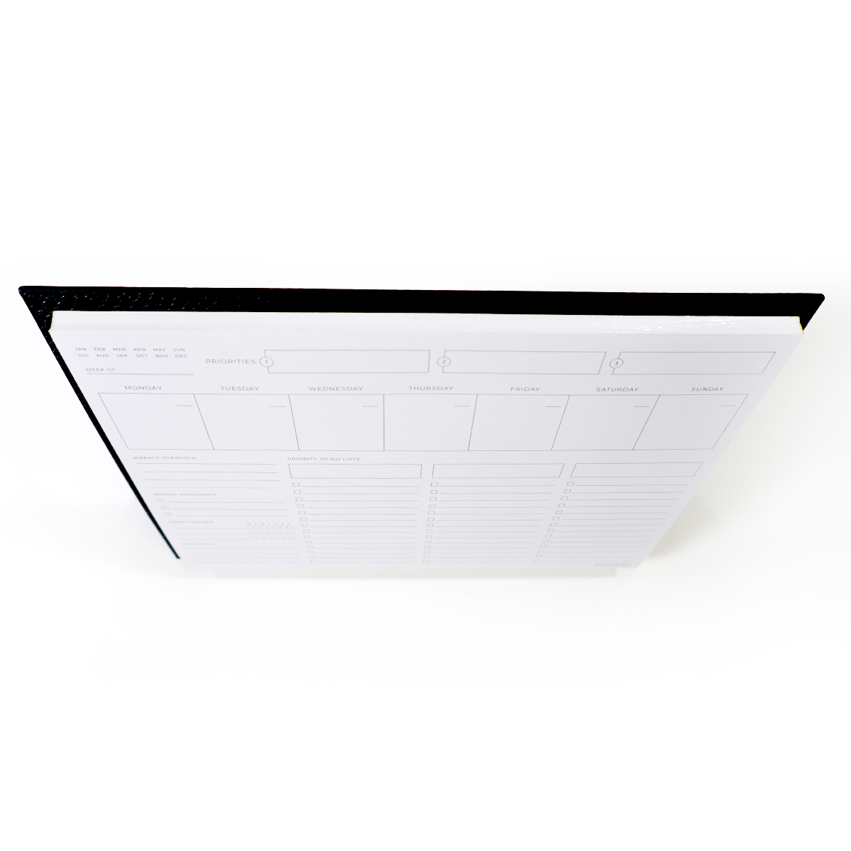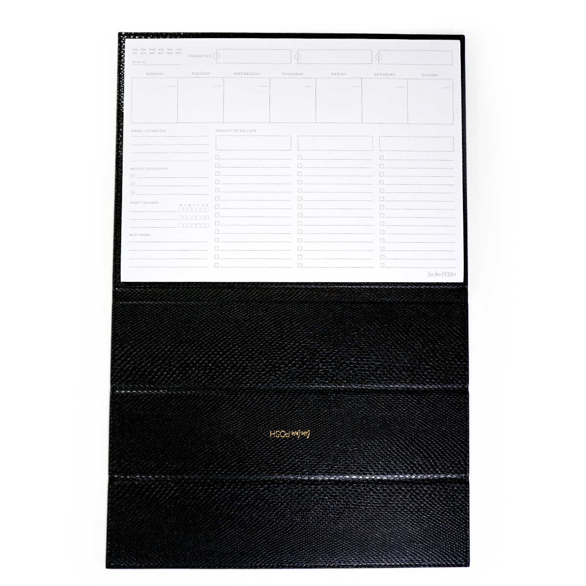 Immerse yourself in refined sophistication with our Large Standing Planfolio in Metallic Black Python. Crafted from vegan leather with an embossed micro python texture and gold gilded pages, this exquisite folio marries elegance and practicality. Featuring a carefully curated weekly layout with top priorities boxes, daily planning sections, and dedicated priority to-dos checklists, it keeps your schedule beautifully organized. Designed to stand upright for effortless viewing, its a statement piece for your desk.