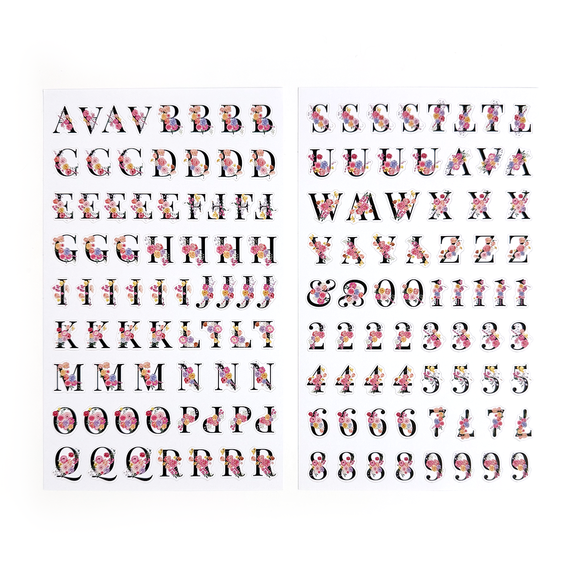 - Featuring florals, deco, functional clusters, functional boxes, alphabet letters + numbers, washi strips, and full size sticker pages.