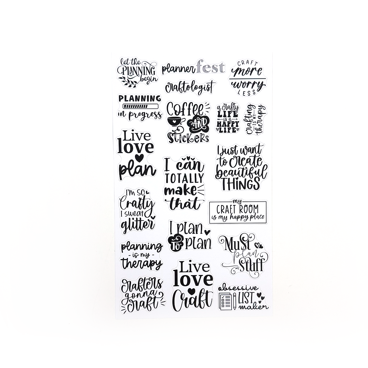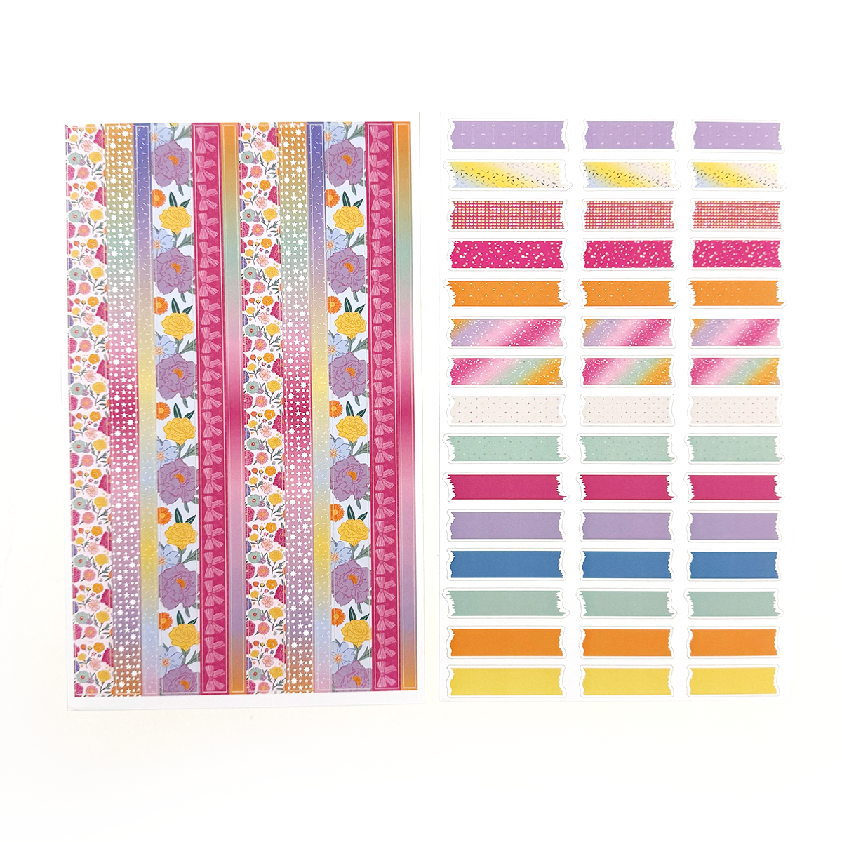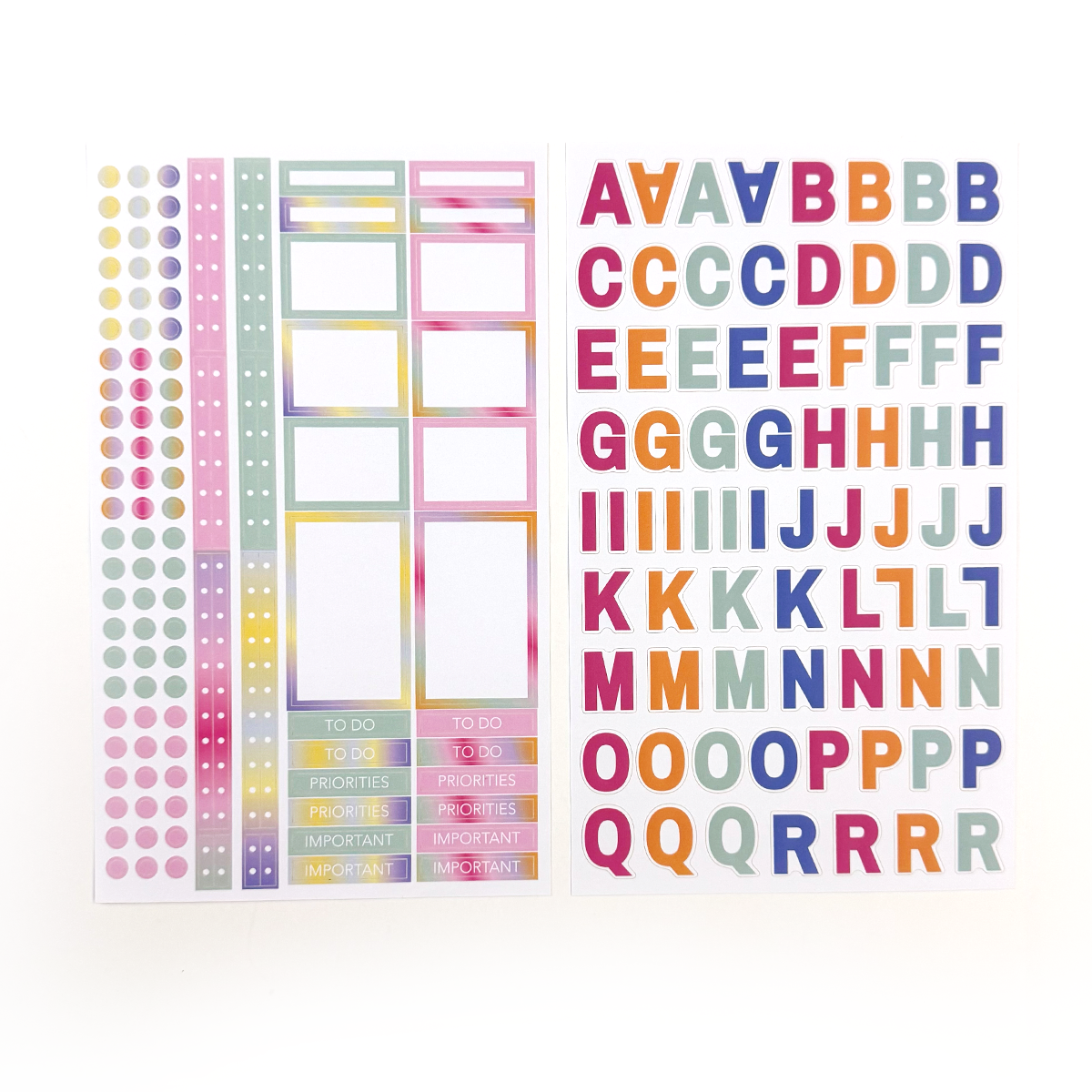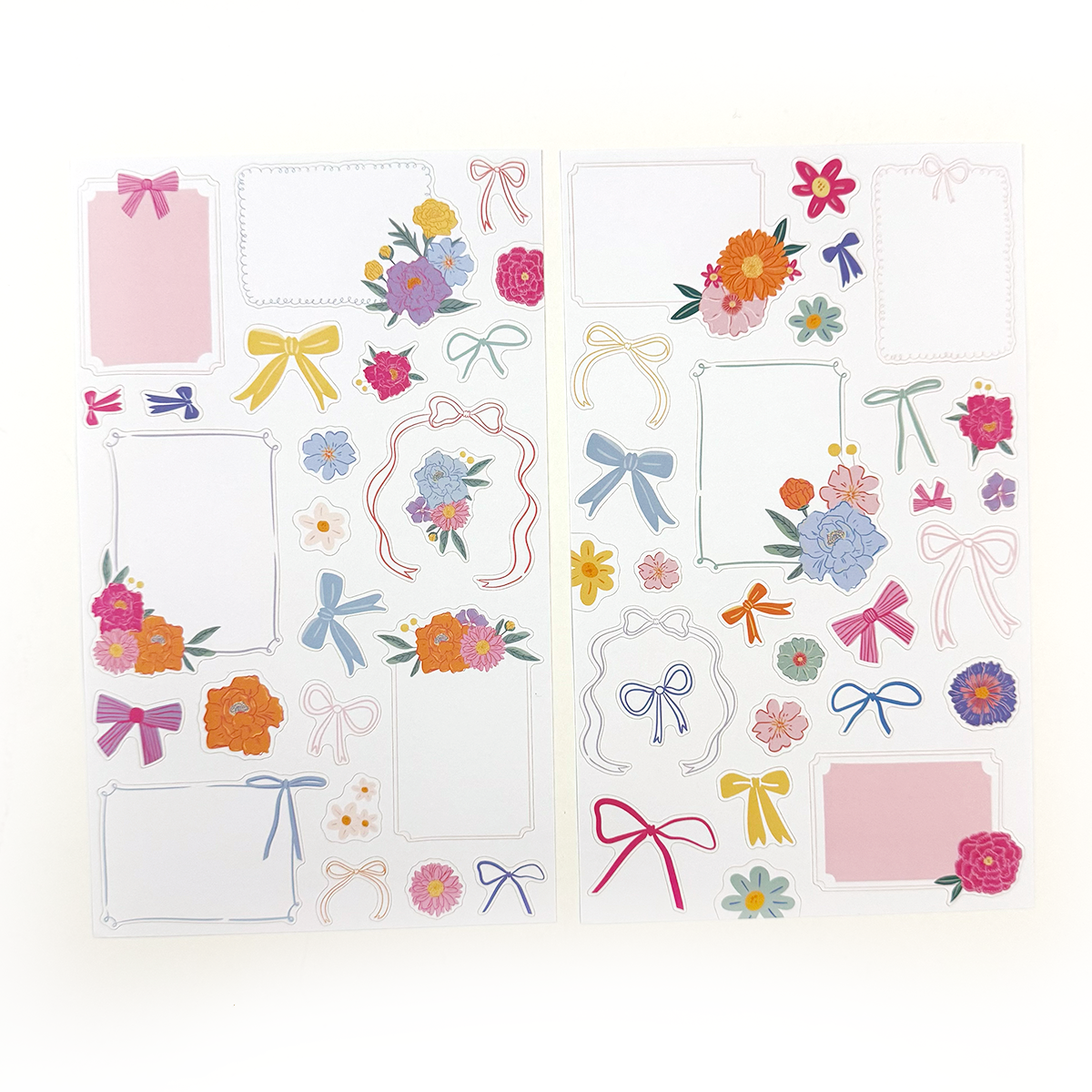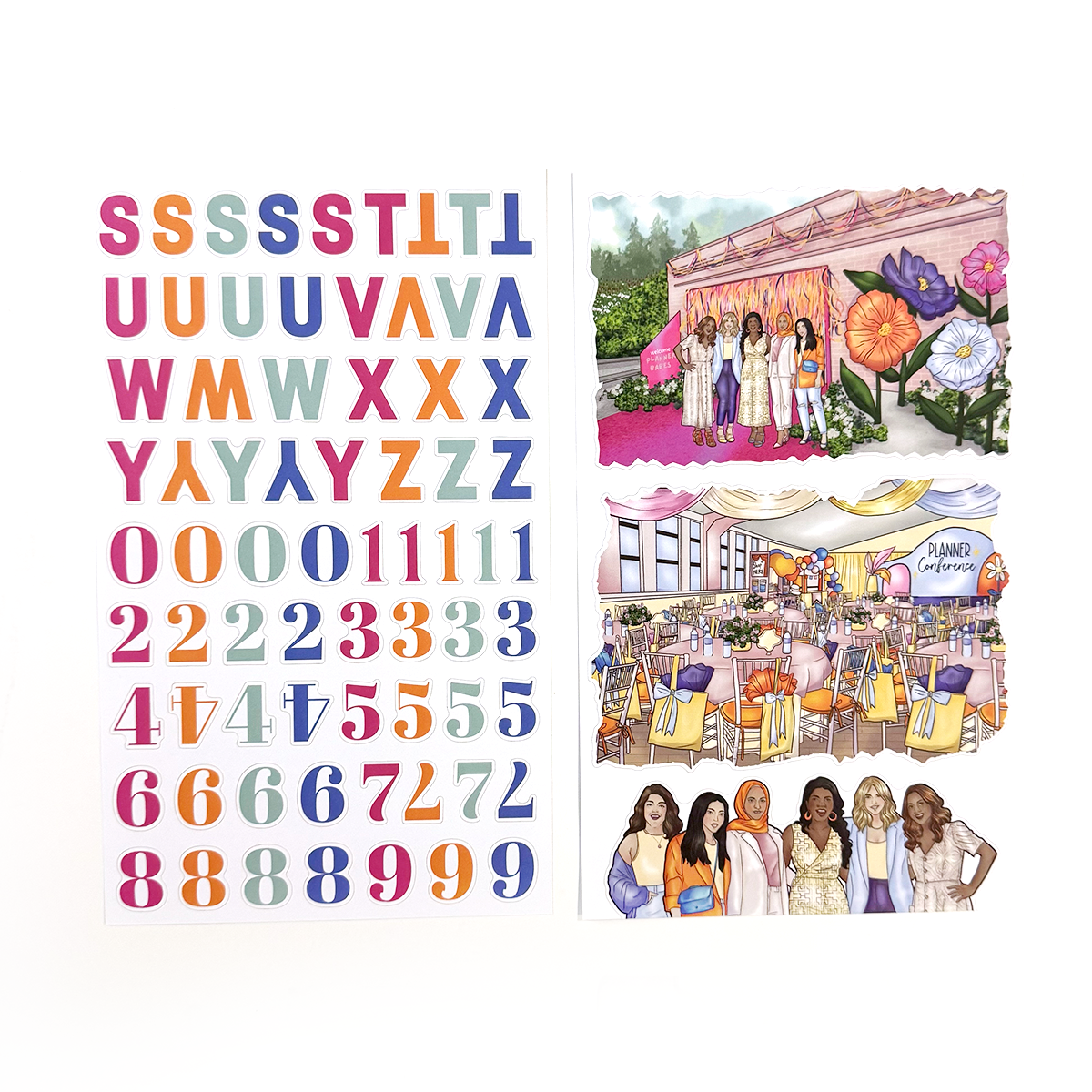 - Stickers feature vibrant florals, planner party deco, beautiful deco boxes, bows, washi strips, washi tape headers, functional boxes, alphabet + letters, planner party scenes, full size deco sticker sheets, and quotes.