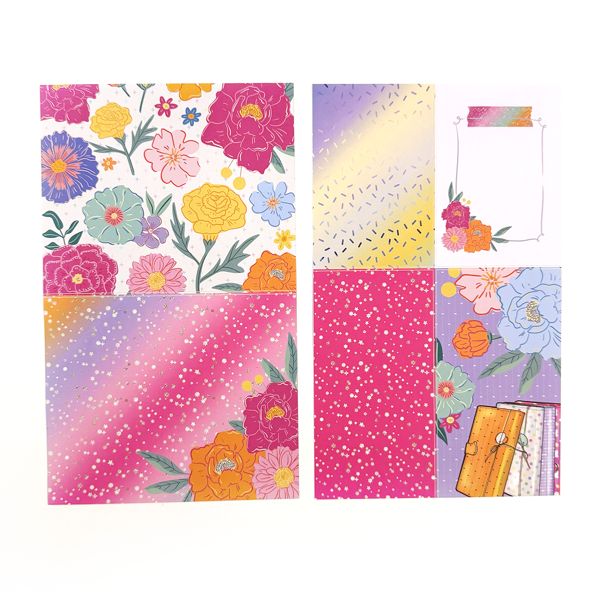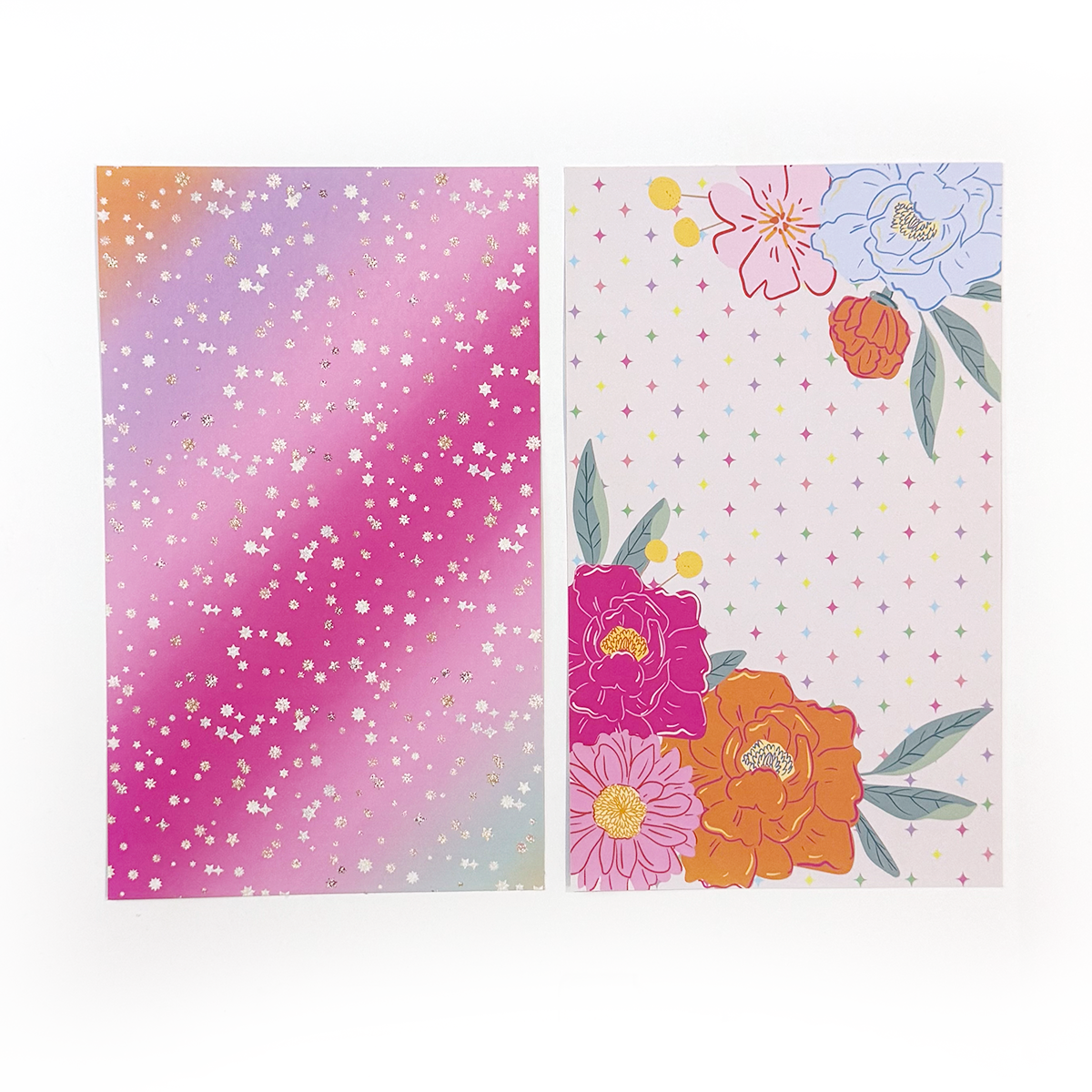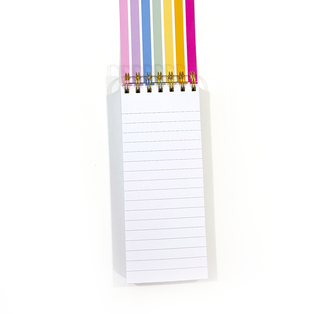 - Notepad features a vibrant floral design on the front and back covers with a bright stripe print on the inside covers.