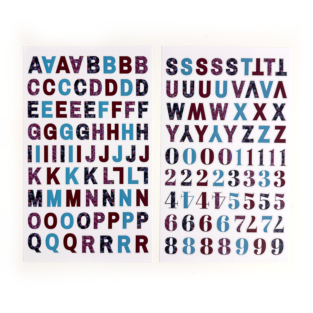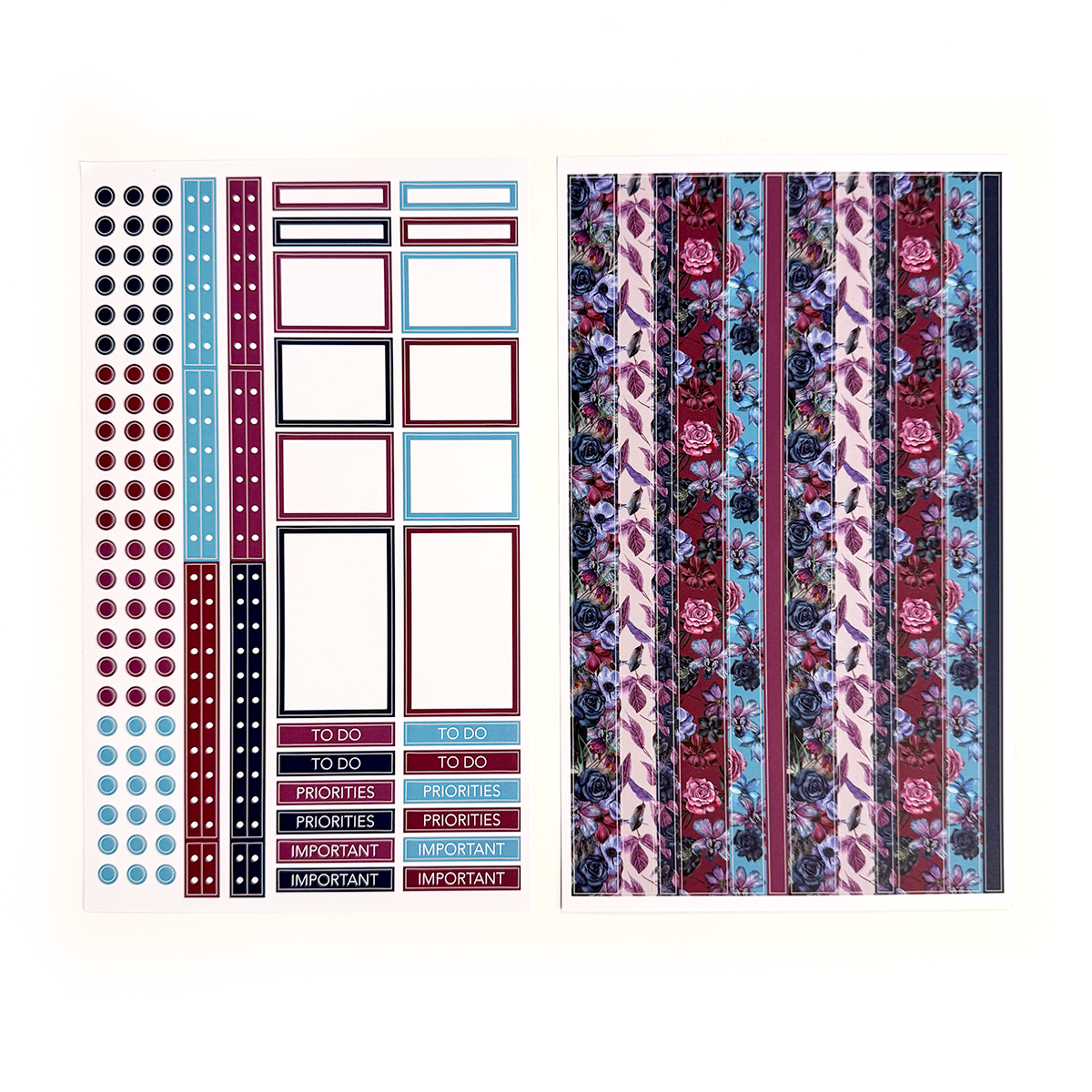 - Featuring florals, deco, functional clusters, functional boxes, alphabet letters + numbers, washi strips, and full size sticker pages.
